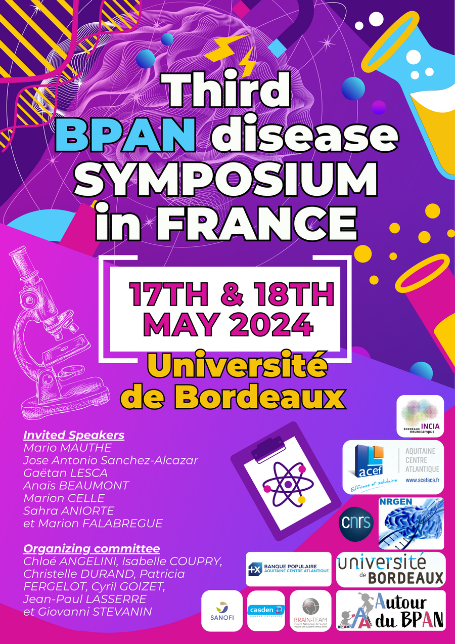L’Université de Bordeaux, l’Association Autour du BPAN se réunissent pour organiser le troisième symposium sur la maladie BPAN à Bordeaux, France. Ce symposium international réunira des organisations de patients, des experts scientifiques et médicaux pour partager les dernières recherches dans le domaine et favoriser les opportunités de réseautage sur la recherche sur la maladie BPAN.